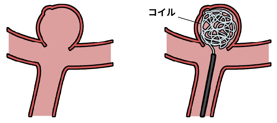 脳動脈瘤の中をコイルで満たし、血液の流れ込む隙間をなくす方法で、動脈からカテーテルを通し、細いコイルを脳動脈瘤の中に差し込む