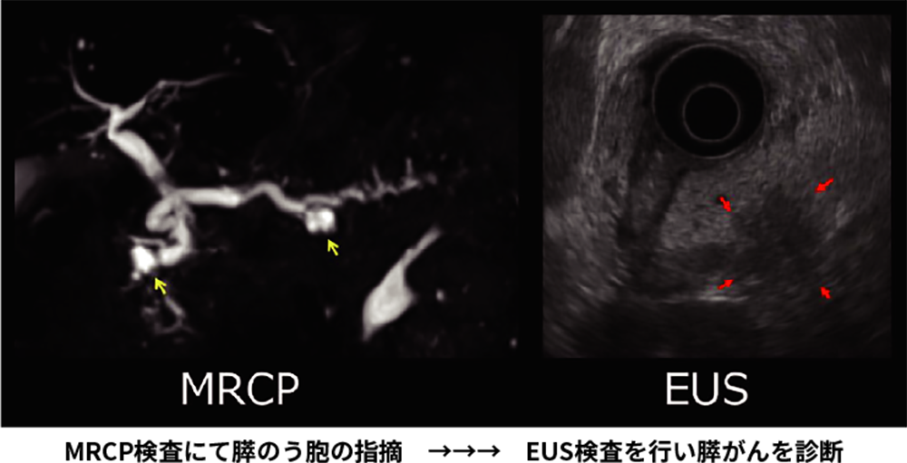 当院では、膵臓全体を詳細に観察することができる超音波内視鏡検査(EUS)や、MRIを用いて膵管・胆管を写し出すMRCP検査、細胞や組織の病理検査などにより診断を行います。
