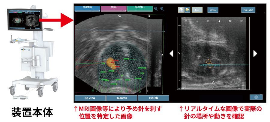 当院では、事前撮影したMRIの画像データを取り込み、超音波によるリアルタイムな画像と組み合わせて確認しながら検査を行うMRI融合画像ガイド下前立腺生検システムを導入しています。
