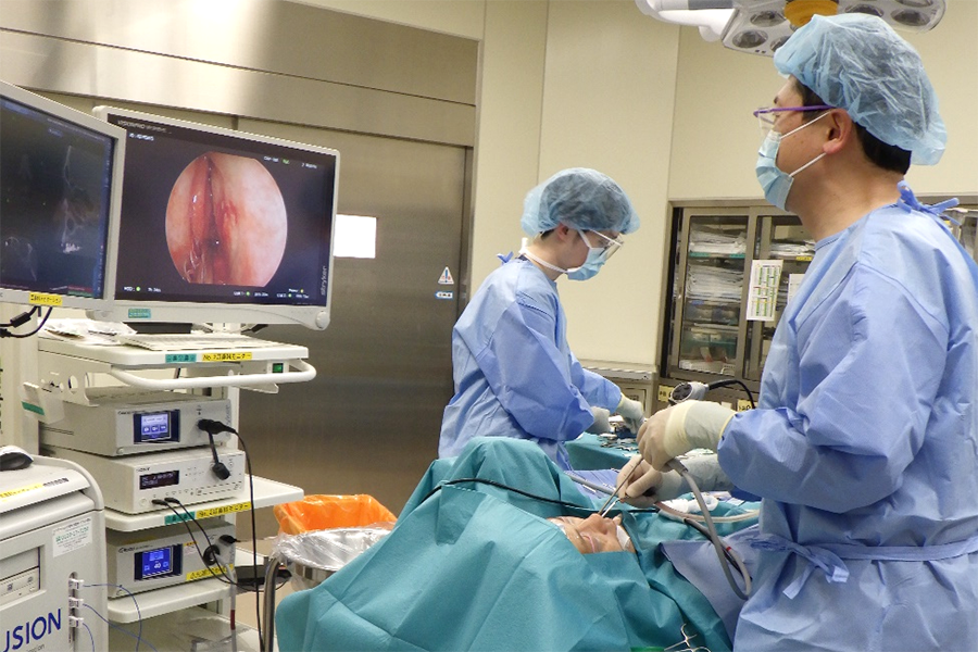 内視鏡で鼻の通り道を広げたり、腫れた粘膜やポリープを除去する「内視鏡下副鼻腔手術(ESS)」は、術後の痛み、腫れ、出血が少なく、副鼻腔の生理機能が比較的保たれる術式で、入院期間が短いのも特徴です。