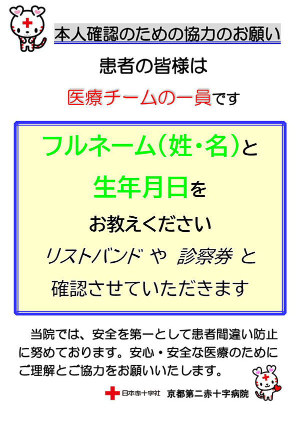 患者さん間違いを防止するため、当院では診療、検査、注射、手術、受付時などご本人であることを確認するために、その都度患者さんご自身にフルネーム(姓名)と生年月日をお伺いいたします。安全の確認のためにご理解とご協力をお願いいたします。 - リストバンドの着用