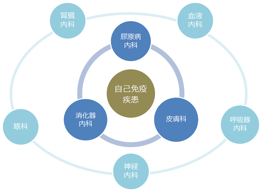 自己免疫疾患は免疫が自分自身の臓器を攻撃することで発症する疾患群で、ほぼすべての診療科において診療が行われています。