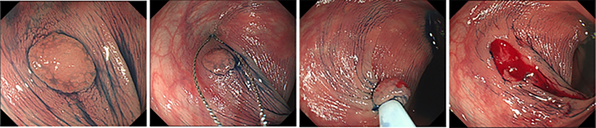 がんになる前の大腸ポリープを内視鏡で取ることで、将来的に大腸がんにかかることを予防できるといわれています。当院では、がんになる前の小さなポリープは、外来での内視鏡検査の際に積極的に取り除いています。これらの小さなポリープに対してはコールドスネアポリペクトミーと呼ばれる方法を主に用いています(図1)。コールドスネアポリペクトミーはスネアを用いて電気を流さずにポリープを切除する方法で、出血や穿孔のリスクが比較的低いとされており安全性に配慮して実施しています。
