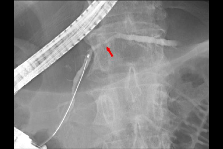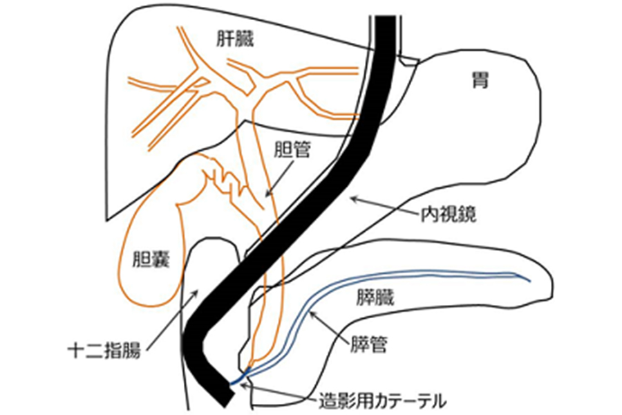 内視鏡的逆行性胆道膵管造影(ERCP)は、内視鏡を口から入れて十二指腸まで進め、胆管や膵管にカテーテルを挿入して造影剤を注入し、胆道・膵管のレントゲン撮影を行う検査です(図1)。