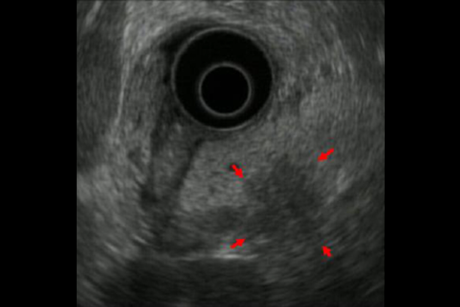 超音波内視鏡(EUS)とは、超音波装置の付いた内視鏡のことであり、“胃カメラ”と同じように口から内視鏡を挿入し、消化管の中から超音波検査を行うことで、空気の影響が少ない状態で、対象臓器・病変の近くで観察することが可能となります。そのため、体外式超音波(US)では十分な観察が難しい胆管や膵臓、通常の内視鏡では詳細がわからない消化管粘膜下病変の詳細な観察が可能であり、それらの臓器や病変に対する精密検査として行います。EUSは、小さな膵癌の描出に有効であり、今後ますます、その役割が重要になってくると考えます。