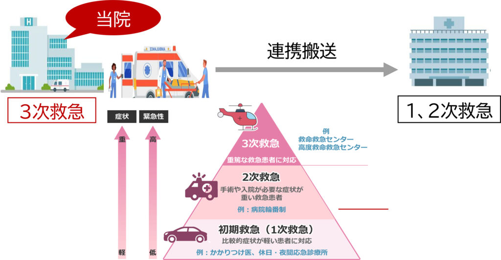 当センターで治療後、命の危険がなくなったと判断された場合、国の医療政策に基づき、二次救急医療を行う連携病院へ転院をお願いすることがあります。これは、当院の高度医療体制を重症患者に迅速に提供し続けるための取り組みです。