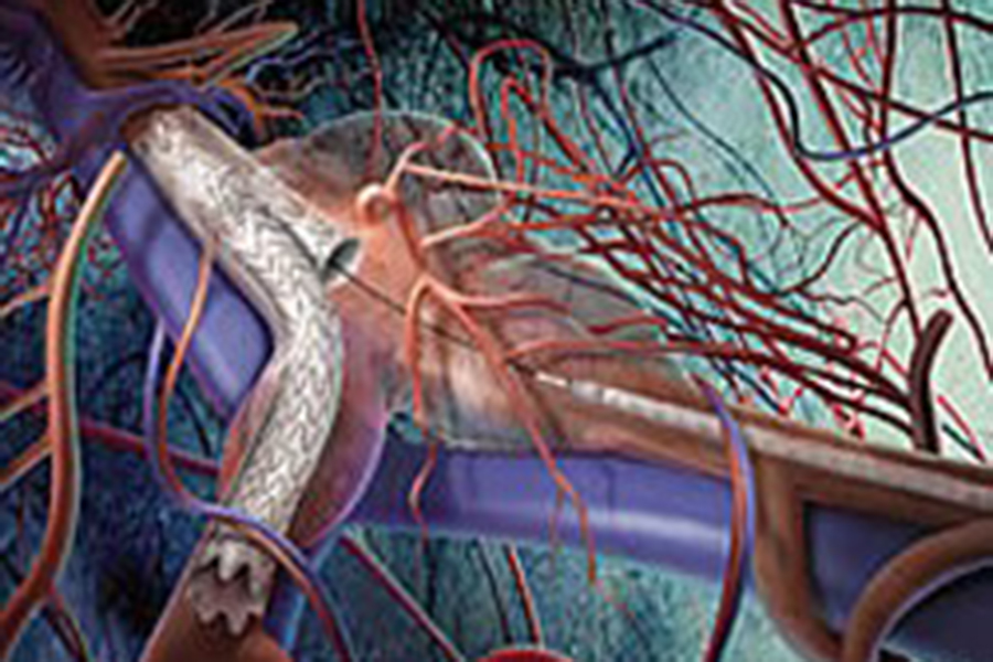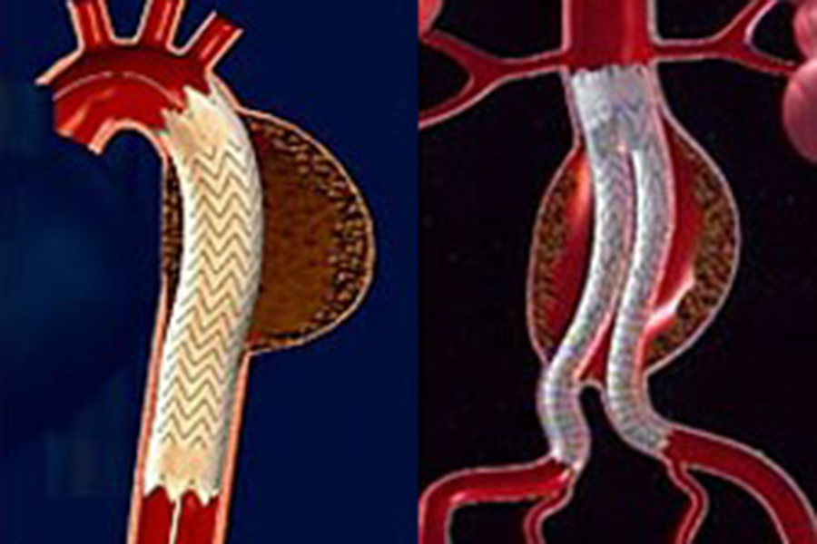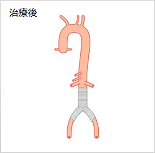 2005年より企業製の大動脈瘤治療用のステントグラフトが保険適応となり国内でも使用可能となりました。ステントグラフトはステントと呼ばれる金属のバネの部分とそれを被覆するグラフトと呼ばれる人工血管の部分からできています。胸や腹を切開することなく、足の付け根の動脈からカテーテルを使用し、このバネ付き人工血管を大動脈瘤の部分に留置します。大動脈瘤はそのままですが、瘤の部分には血圧が直接かからなくなりますので、破裂の危険がなくなります。通常の手術に比べ体の負担が少ないのが特徴です。