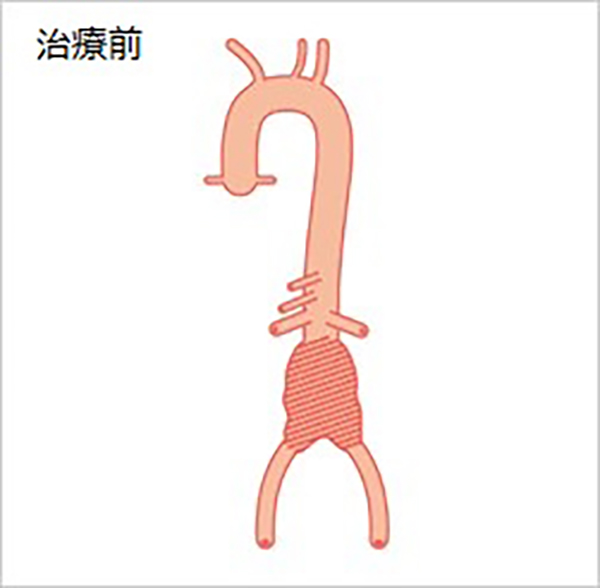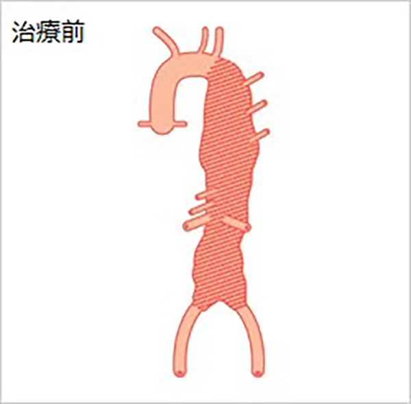胸腹部大動脈瘤とは、胸部から腹部にかけての広範囲に動脈瘤ができている病気です。 胸腹部大動脈瘤に対する手術は、大動脈手術の中でも最も困難な手術の一つと言われていました。しかし、私どもの施設では、この胸腹部大動脈瘤に対しても積極的な手術治療を行っています。