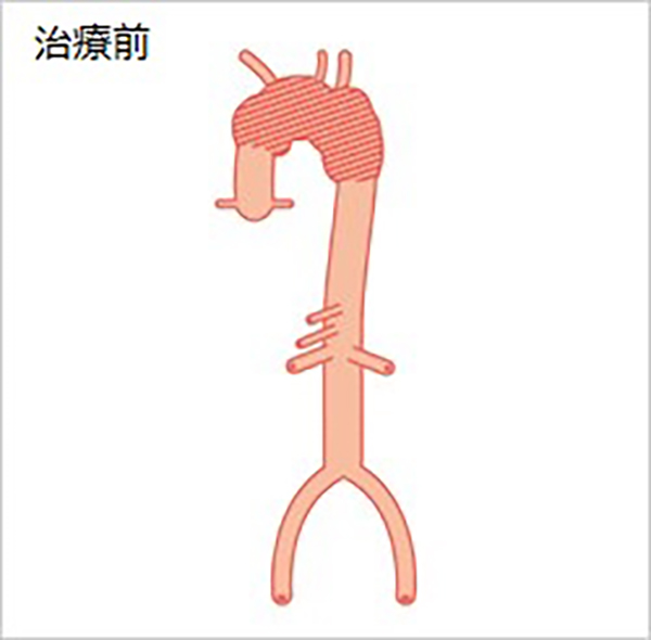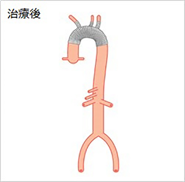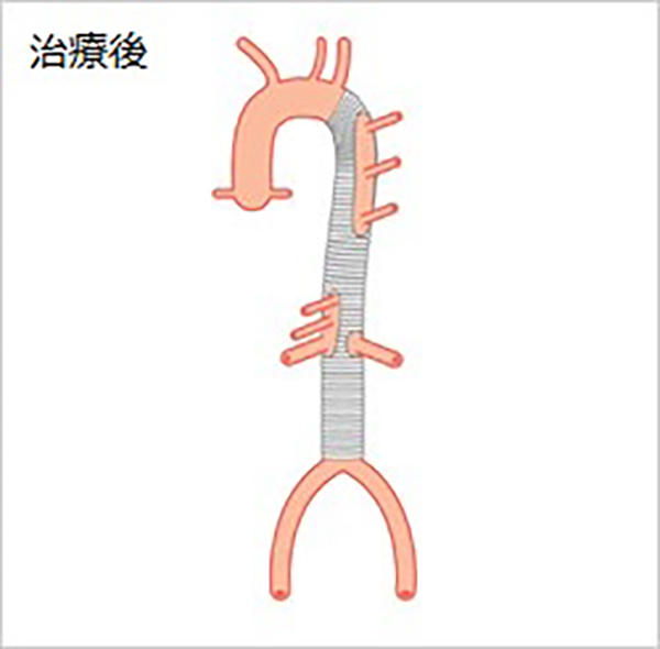 この手術で問題となるのが手術中の脊髄保護です。 この、脊髄保護が不十分な場合、術後に対麻痺という下半身の神経障害を起こします。私どもの施設では、侵襲、出血の少ない手術方法と、脳脊髄液ドレナージ(背中から脊髄に細いチューブを挿入し、脊髄の血流を改善させる方法)や、脊髄保護剤などの複数の脊髄保護法を組み合わる事で、現在、脊髄神経障害の発生を抑えています。この手術では多くの場合輸血が必要です。手術時間は通常6~8時間で、入院期間は2~3週間です。