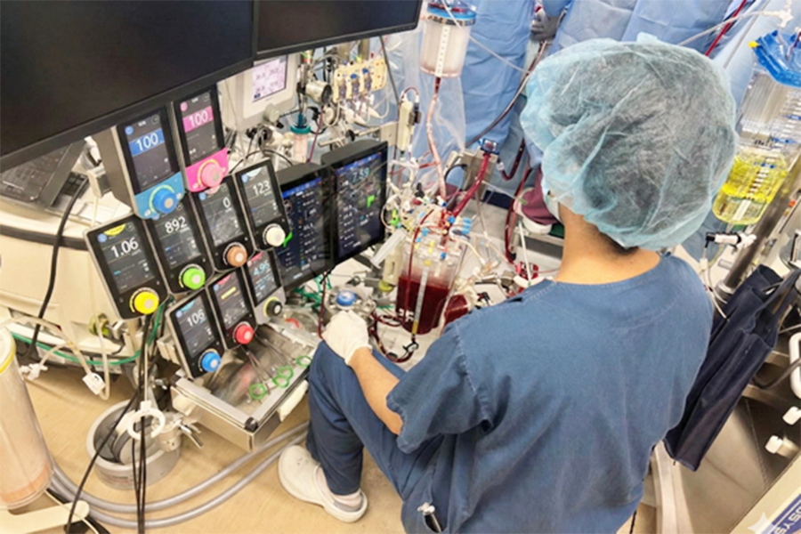 心臓血管手術では、医師とコ・メディカルスタッフ(臨床工学技士、看護師)が一体となり心臓・大血管疾患の治療をしています。臨床工学技士の役割は人工心肺装置、IABP装置(大動脈内バルーンパンビング)、ECMO(補助循環装置)、IMPELLA(補助循環用ポンプカテーテル)、自己血回収装置、胸腔鏡手術時の内視鏡接続などの操作・管理です。