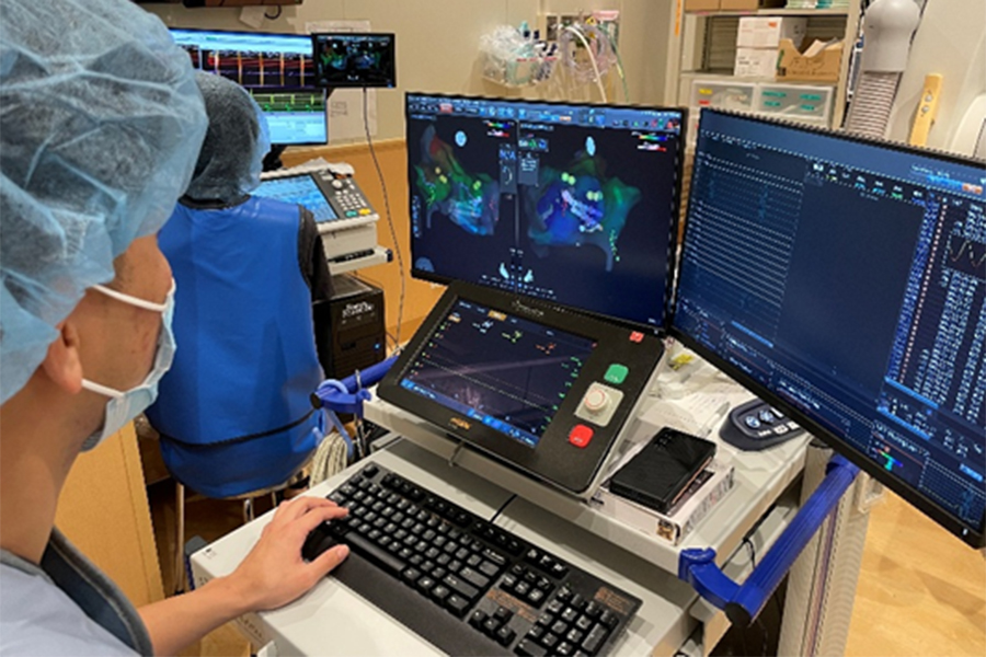 頻脈性不整脈に対するABL業務は医師、看護師、薬剤師、放射線技師、臨床工学技士がチームとなり治療を行っています。臨床工学技士の業務として、電気生理検査記録解析装置(EP RECORDING SYSTEM)や心臓電気刺激装置(Cardiac Stimulator)、高周波発生装置、3D Mapping Systemなどの装置を操作しています。また心房細動に対する最新治療機器パルスフィールドアブレーション(PFA)を導入しており、手術時間の短縮や放射線被ばく量の軽減も図っています。
