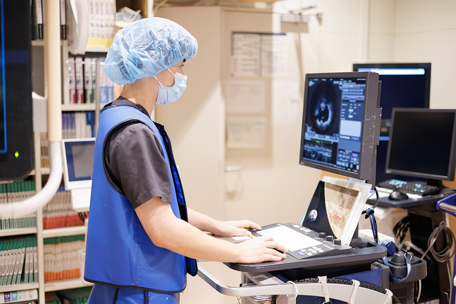 心臓、末梢血管を診断、治療するカテーテル検査は、循環器内科医、看護師、薬剤師、放射線技師、臨床工学技士でチームを組み(Innovation Team)、多職種で協力連携しながら業務を行っています。臨床工学技士の業務として循環動態の監視、血管治療の標準となっている各種診断装置(IVUS(血管内超音波)、OCT(光干渉断層法)、FFR(冠血流予備量比)など)の操作、Rotablator、DIAMONDBACK、IVLなどの特殊治療装置の操作になります。また、循環動態が不安定であれば心臓機能を補助する補助循環装置IABP(大動脈バルーンパンピング)、PCPS(経皮的心肺補助装置)、IMPELLA(補助循環用ポンプカテーテル)や体外式ペースメーカを使用し、それらを臨床工学技士が操作・管理しています。