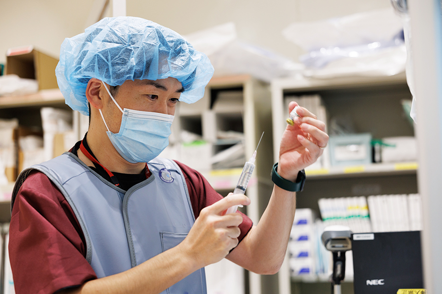 2024年10月から、薬剤師が平日日勤帯に手術室の清潔エリアへ常駐しています。クリーンベンチを用いたPCAポンプの調製や、緊急手術への対応を通じて、医師や看護師の負担軽減や手術間隔の短縮に貢献しています。また、患者の術前・術中・術後の状態を把握することで、抗菌薬の適正使用の推進、鎮痛薬の投与量および投与間隔の適正化など、医療安全の向上にも大きく寄与していると考えています。