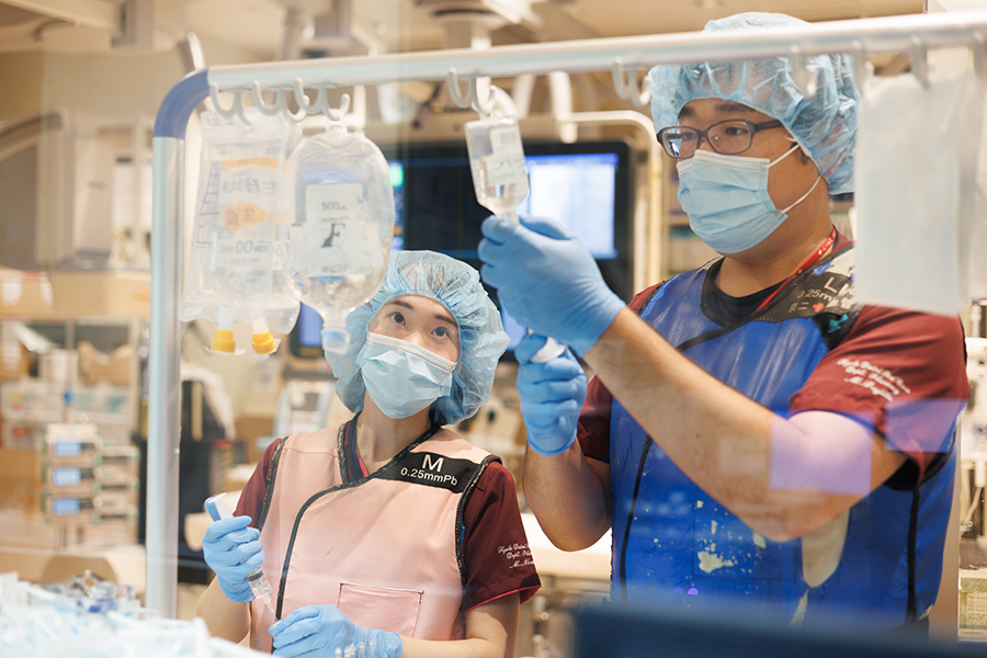 2025年4月から薬剤師が平日日勤帯のアンギオ室に常駐しています。アンギオ室では心臓血管カテーテル治療や脳血管内治療が行われ、多種多様な薬剤が使用されます。薬剤師は術前から患者さんの常用薬と造影剤をはじめとする術中の使用薬剤との相互作用の確認を行っています。さらに各手技で使用する薬剤をセット化して管理することや術中の使用薬剤の調製を行い、チームの一員として安全な治療に務めています。
