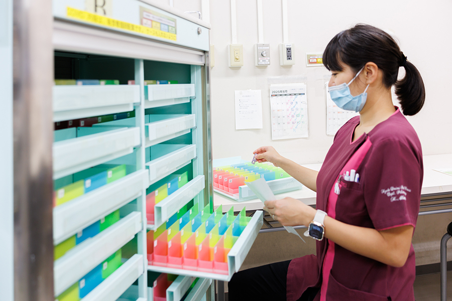 全病棟に専任薬剤師を配置し、服薬・投与状況の確認、処方内容の確認、患者状況の把握と処方提案、患者さんへの指導、副作用のモニタリング、退院時指導等を行なっています。また、病棟における麻薬や向精神薬・ハイリスク薬を含む医薬品の適正な保管・管理や、医師・病棟スタッフへの医薬品に関する情報提供や医師や看護師からの質問に対し、迅速に対応できる体制も整えています。さらに、医師の回診やカンファレンスに参加し、治療方針や患者状態等の情報を共有して、他職種と連携しています。