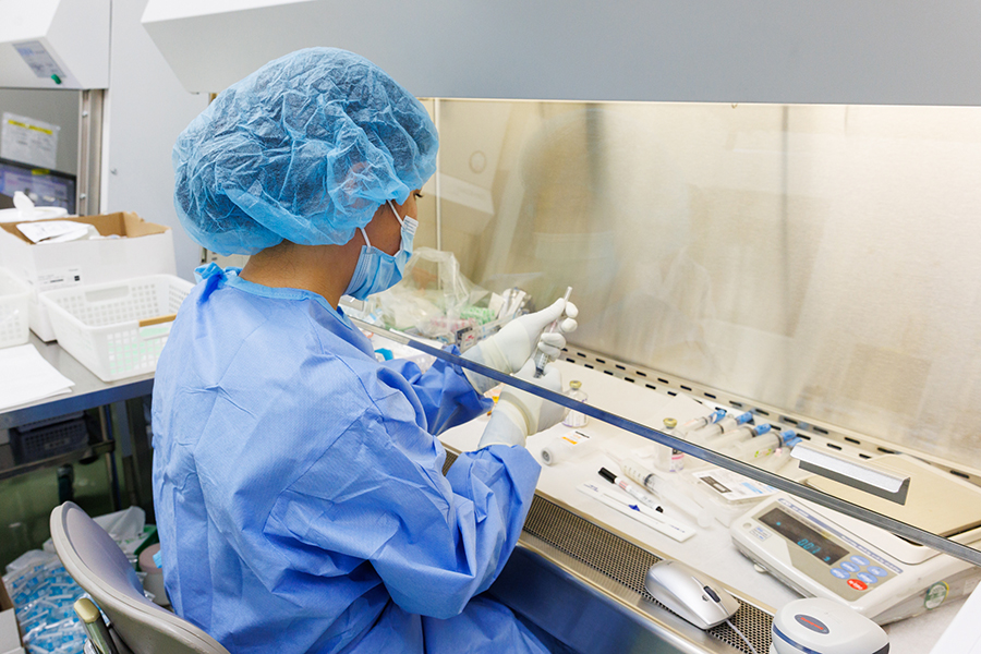 手術後等、経口・経腸摂取不能な患者さんに十分な量のカロリー・栄養素・ビタミン類・電解質・微量元素等を経中心静脈的に投与する治療法があります。高カロリーであるがゆえに、細菌にとっては絶好の培地になるため、クリーンルームという無菌室内で厳密な操作により混合をしています。このことは、院内感染の予防にもつながります。