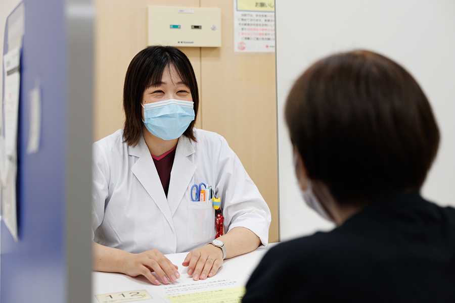 外来患者さんの薬物療法の質と医療安全の向上を推進することを目的に開設されました。インスリン等の自己注射やデバイスを用いた吸入指導をはじめ、内服抗がん剤や医療用麻薬を使用されている患者さんにお薬の効果や服用方法、副作用や生活上の注意等の説明を行ったり、服薬管理の向上、副作用対策、処方内容(投与量や相互作用等)を医師に情報提供したりしています。副作用に伴う“つらさ”を軽減し、安心して薬物療法を継続し、クオリティ・オブ・ライフ(QOL:生活の質)の向上に尽力しています。