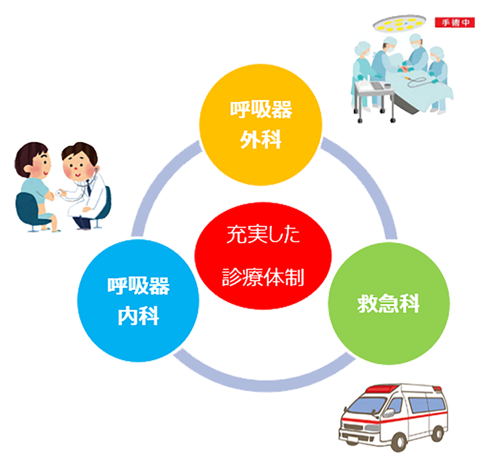 当センターには「呼吸器外科・呼吸器内科・救急科」の3科の医師が所属しており、院内で密接に連携を図りながら診断・治療を行ってまいります。