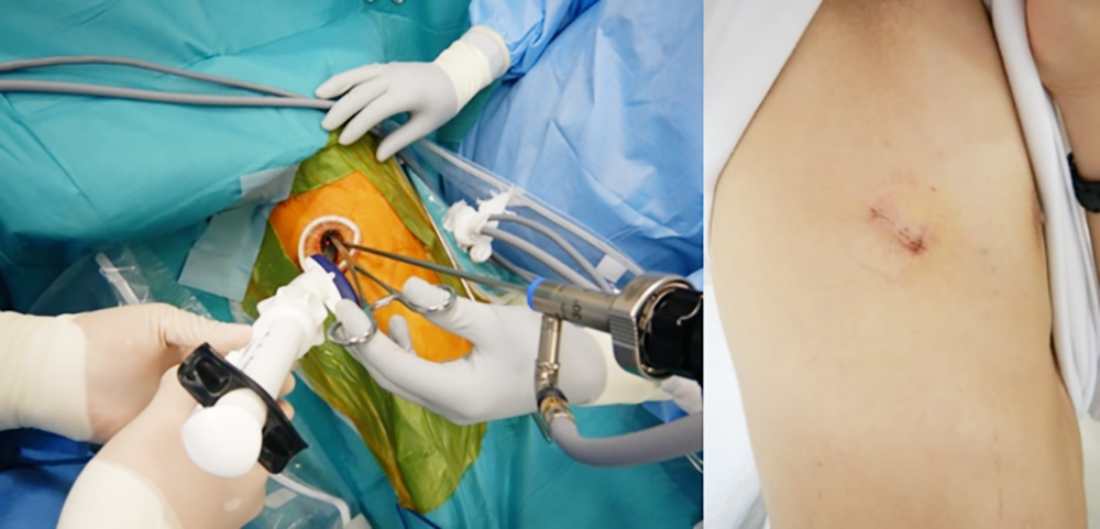 気胸の手術療法として、ほぼ全例において胸腔鏡下手術を行います。肺気腫で癒着が強い場合などには一部小開胸創を設けることがありますが、通常は1.5cm程度の傷が1〜3個のみで手術可能です。気胸の原因となるブラを切り取ったり結紮したり焼灼して処理します。胸腔鏡下手術は傷が小さく痛みも少ないのでいいのですが、再発率は開胸手術よりも高く10〜20%との報告があります。不十分な視野によるブラの見落としや切除ライン近傍のブラ新生がその原因と言われています。当院では、再発予防目的にポリグリコール酸シート(ネオベールシート)や酸化セルロースシート(サージセルシート)で肺表面を覆うことで再発率を下げる工夫をしています。気胸術後の入院期間は2〜3日となっています。傷の痛みさえ我慢できる様であれば、退院直後よりデスクワークや学校への通学は可能になるため、早期の社会復帰が見込めます。また、併存疾患や全身状態不良のために全身麻酔がかけられず手術加療が難しい患者さんには、胸腔内に薬剤を注入する癒着療法やシリコン製の気管支充填剤を気管支鏡下に塞栓する気管支塞栓術を選択することも可能です。