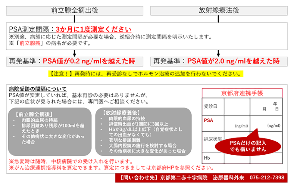 前立腺癌や腎癌に限らず、泌尿器科疾患に関しては地域医療連携室経由で外来の予約を受け付けております。また前立腺癌の治療後の患者は基本的に逆紹介を行い、再発による当院への再紹介の基準も設けております。