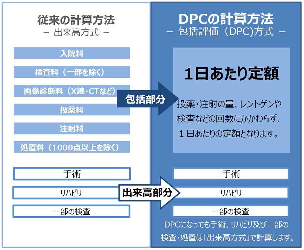 - 全ての患者さんがDPC制度の対象となるとは限りません。病名や治療内容によって異なり、場合によっては、以前の「出来高払い方式」になる場合もあります。