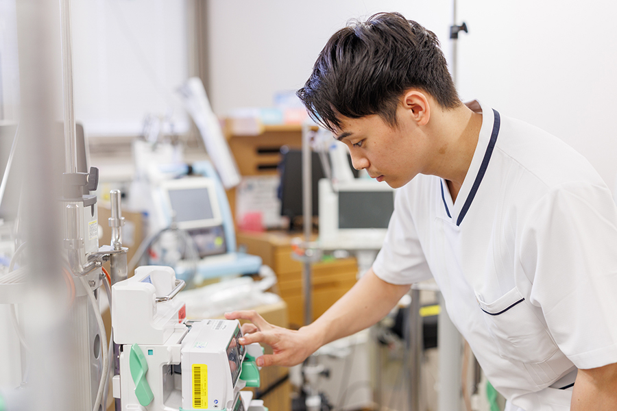 ICUには脳梗塞や脳出血、心筋梗塞や呼吸不全、多発外傷、重症熱傷、薬物中毒等の患者さんが入室されています。PNS体制の下、先輩看護師と2人でこのような重症患者さんを担当しています。