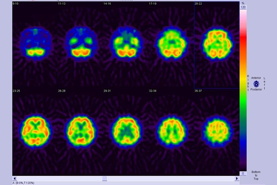 脳の血流状態を画像化して、脳の機能異常を診るために行われます。脳梗塞や認知症の早期発見や脳梗塞における治療の適応、治療効果の判定などに有用です。検査時間は1時間程度で、特に検査前の処置は必要ありません。(図1脳血流シンチ画像)