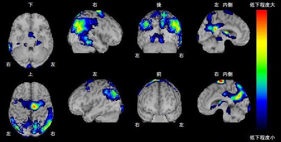 得られた脳血流画像を標準脳の形態に変換し統計学的な手法を用いて解析を行うソフトを使用することで、アルツハイマー型認知症やレビー小体型認知症など認知症の早期診断や病型診断に役立っています。(図2統計学的解析ソフト)