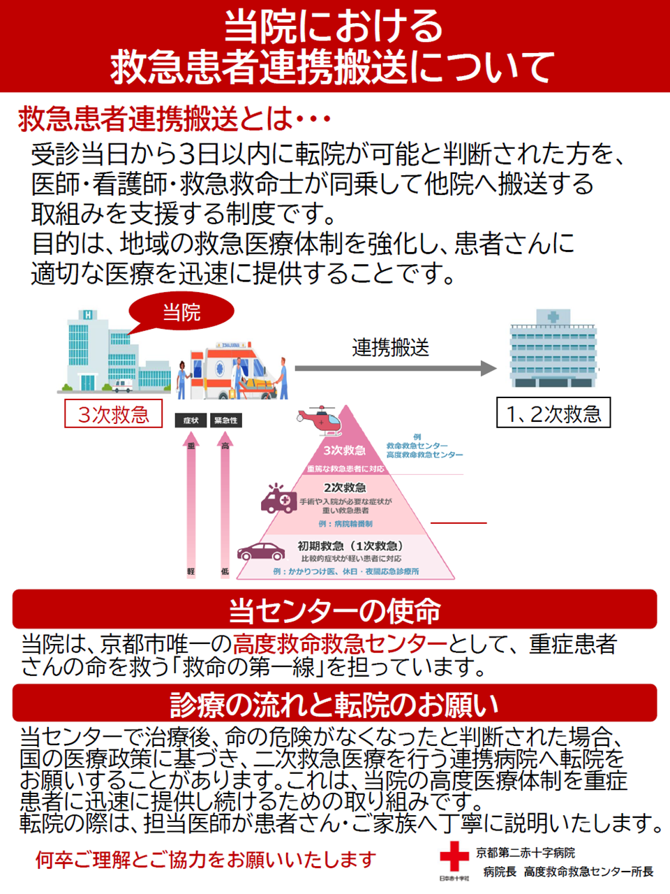 京都第二赤十字病院は「歩み入る人にやすらぎを、帰りゆく人に幸せを」を理念に最善の医療を提供いたします。