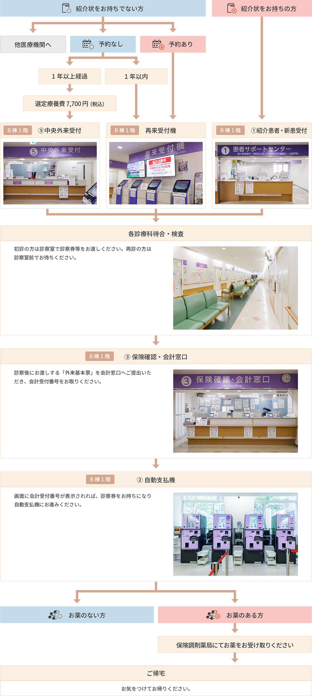 - 診察券でB棟1階再来受付機にて受付をしてください。