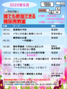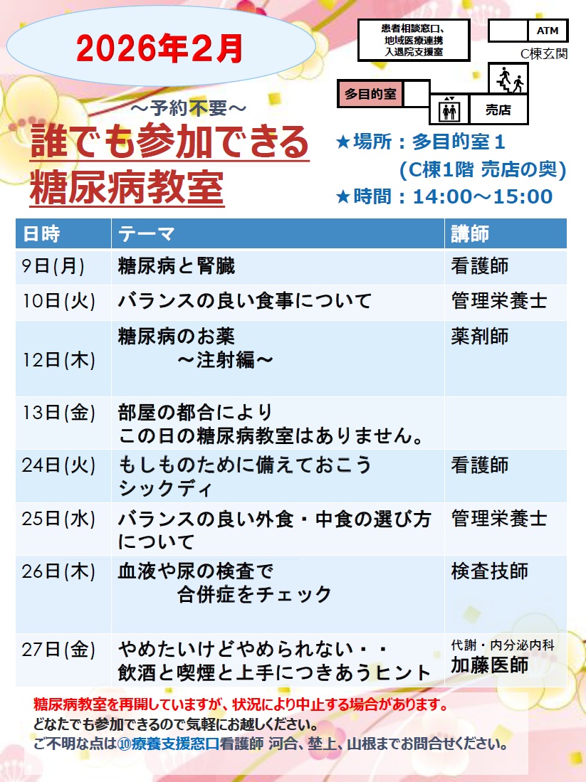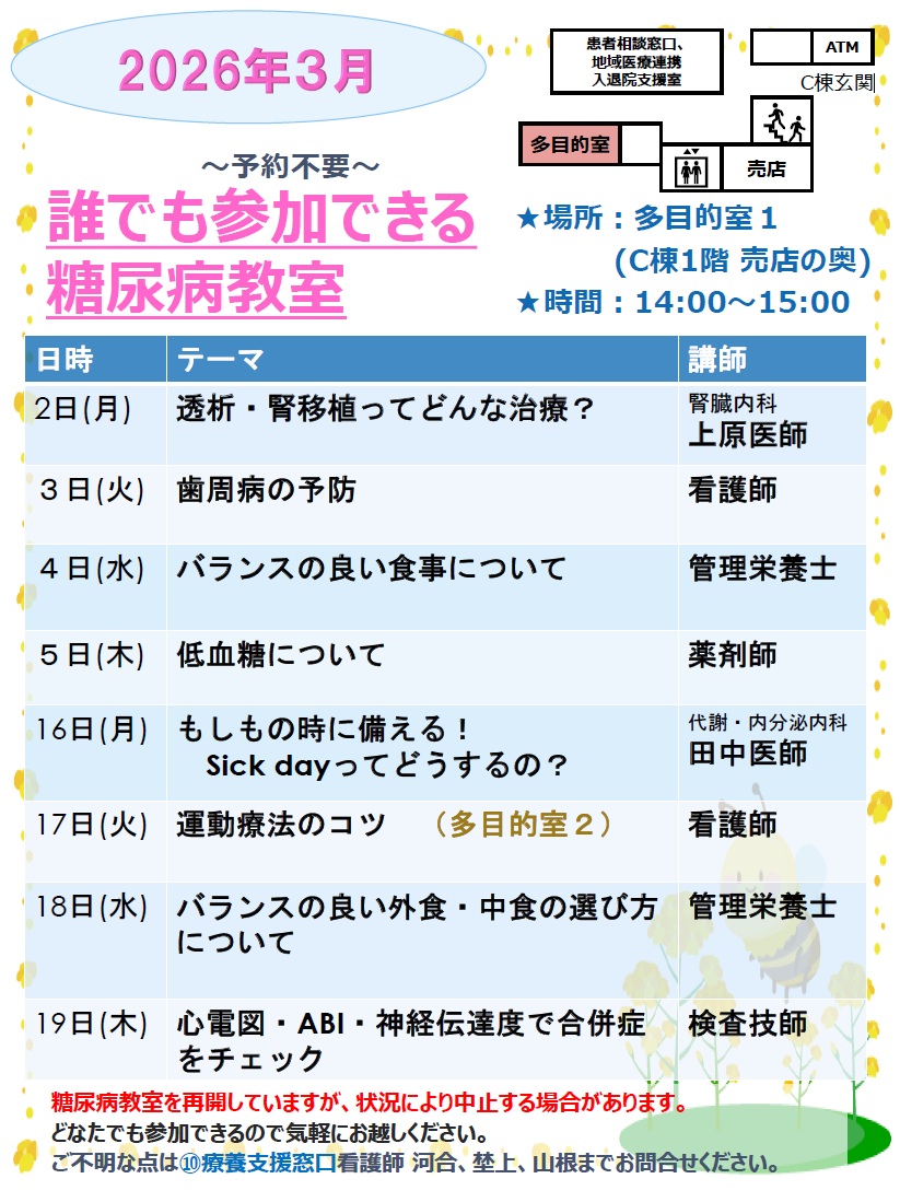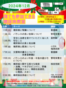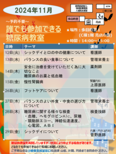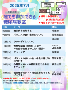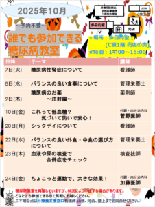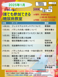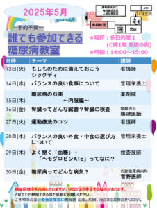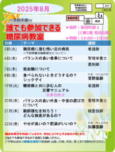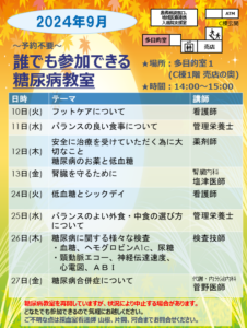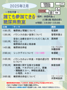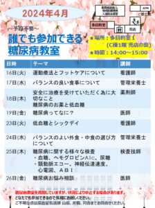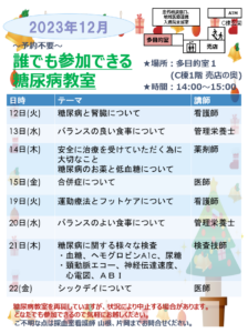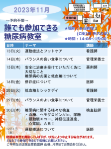 当院では、外来通院患者さんだけでなく、たくさんの方が「糖尿病教室」に参加していただけるよう、月ごとの予定表を掲載しております。
