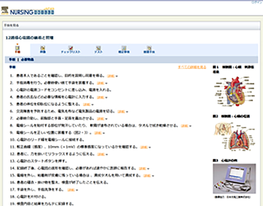 チェックリストやテストも掲載されているので、看護技術の自己学習に役立ちます。また、はじめて行う看護技術や診療の補助などが予定外に入ったときなども、部署のパソコンですぐに確認することができます。